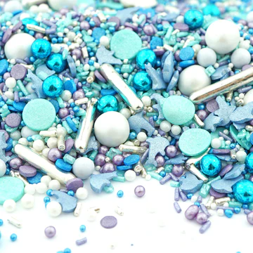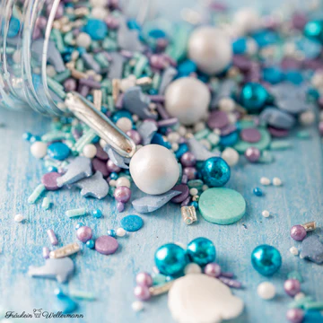 Der Meeresrauschen-Mix ist der perfekte Backbegleiter, wenn Sie an Ihr nächstes Unterwasser-Backwerk denkst, hervorragend für die nächste Meerjungfrau-Party, den Delfin-Geburtstag oder den Auftakt-Kuchen für die Freibadsaison. Neben den blauen Mini-Delfinen und weißen, großen Streuselmuscheln tummeln sich viele kleine blaue Konfetti in klein und groß und dazu jede Menge  aus weißen Streuselperlen und Nonpareilles. Dazu knalligblaue Mini-Knusperkugeln, große weiße zarte Schokokugeln und silberne Zuckersticks. So viel Meeresrauschen in einer Dose… wie zauberhaft für Meeresfreunde