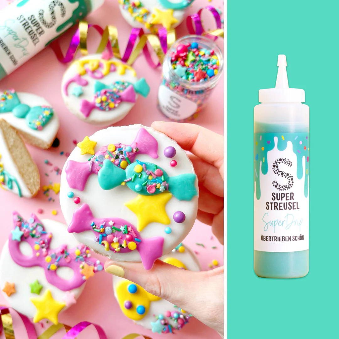 Erwärmen Sie den SuperDrip in der Mikrowelle oder im Wasserbad. Danach können Sie damit Muffins, Kekse, Kuchen und Eisdekorieren. Oder Sie machen damit Ihre eigenen CakeTopper – ist supereasy! Ser SuperDrip trocknet viel schneller als Schokolade und ist damit der perfekte Untergrund für Ihre Super Streusel.