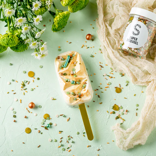 Bei soviel grün und nochmals grün, sitzen wir fast schon im Dschungel, lauschen den mystischen Klängen der Dschungelwelt und schwingen uns von Liane zu Liane. Dieser Streusel-Mix ist wirklich traumhaft geworden! schöne Farbtöne in Olivgrün, salbeigrün, elfenbeinbeige, bronze und gold. Als Konfettistreusel, Nonpareilles, mit Kupfer Schokokugeln und Mini-Knusperkugeln in metallicgrün.
