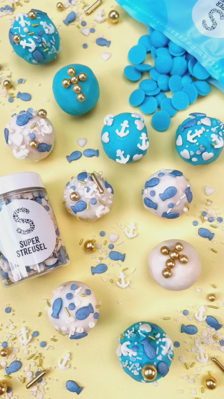 Moin Moin! Leinen los und ab geht der Wellenritt aufs offene StreuselMeer. Heilig´s Fischle ist der schöööön! Wir sehen die StreuselFischchen schon auf einem Meer von Sahne und Buttercreme, auf maritimen Kuchen und mega Torten zur Kommunion, Firmung oder zur Taufe. Ein richtiges Multitalent für die Kaffeetafel, unser HeiligsFischle. Dor is halt allens drinnen, wat du bruchst, würd der Hamburger Seemann sagen: Fische, Anker und Herzen! Dazu goldene Zuckersticks und Schokokugeln sowie Konfettistreusel in zartem Blau und Weiß.