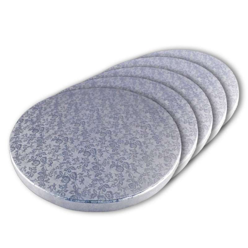 Diese Tortenunterlage ist praktisch als Unterlage, zur Präsentation von Torten und Kuchen. Mit silberner Beschichtung und Motivprägung.